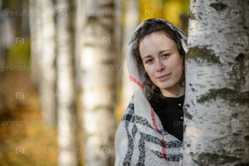 Молодая женщина в платке в осеннем парке