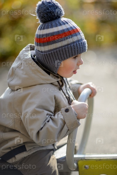 Трехлетний мальчик катается на качелях на детской площадке