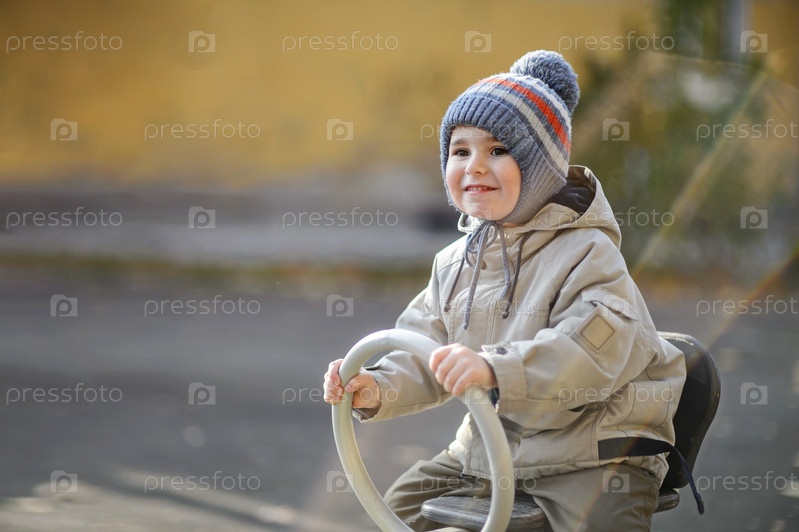 Трехлетний мальчик катается на качелях на детской площадке