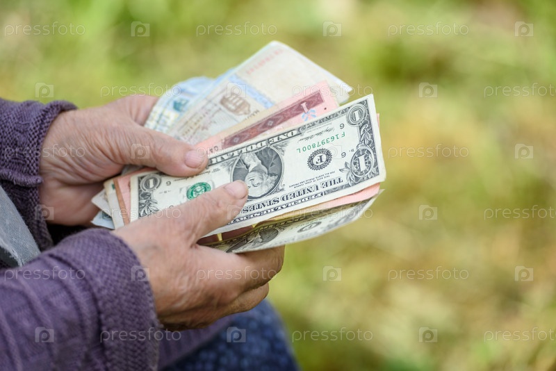 Старуха рассматривает банкноты - руки и деньги крупным планом