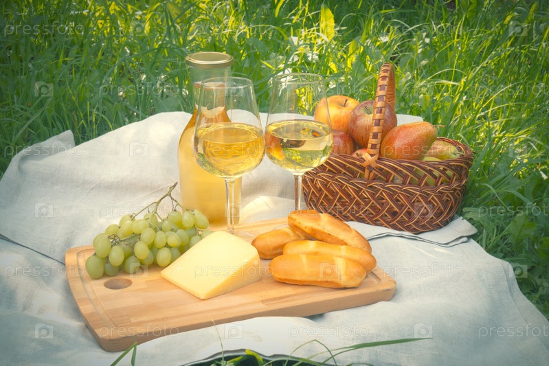 Пикник с бутылкой и бокалами белого вина, сыра, хлеба и фруктов