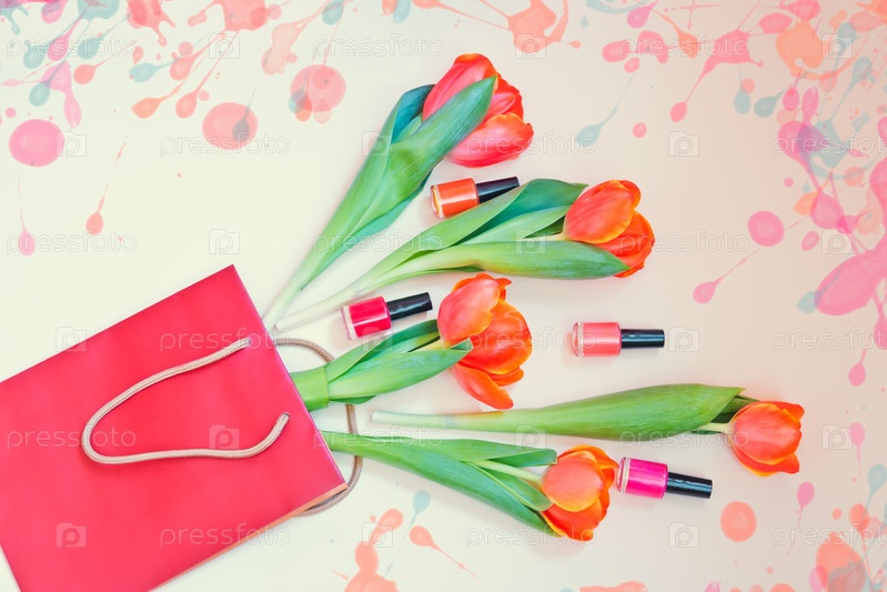 Свежие оранжевые цветы тюльпана и лаки для ногтей в бумажном пакете на бежевом фоне. Вид сверху с копией пространства