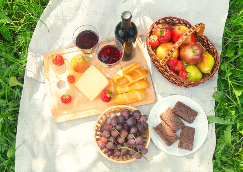 Место для пикника на открытом воздухе с красным вином, сыром, фруктами и пирожными. Вид сверху