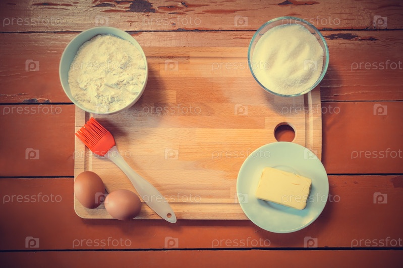 Яйца, масло, мука, сахар и разделочная доска на деревенском деревянном фоне. Вид сверху с копией пространства