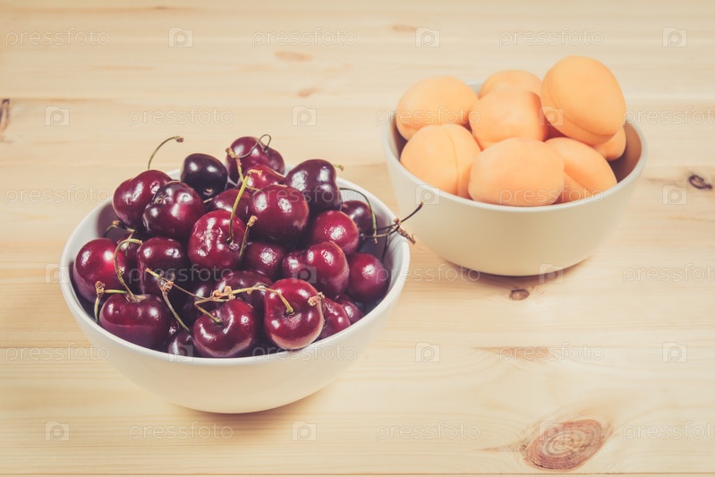 Миски, полные свежих ягод вишни и абрикосов на деревянном фоне. Выборочный фокус