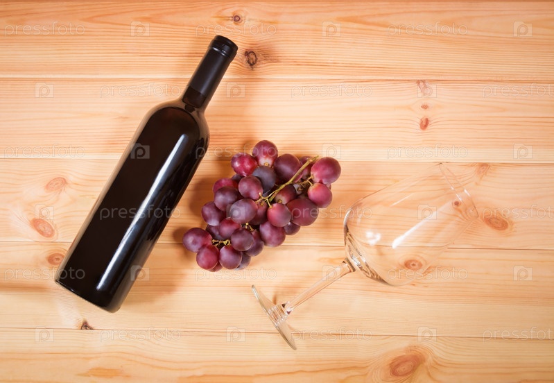 Бутылка красного вина, фиолетовый виноград и бокал на деревянном фоне