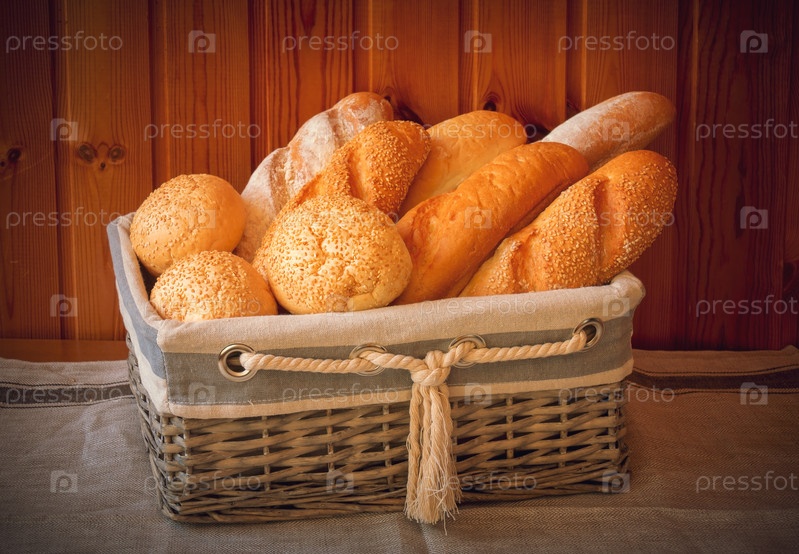 Свежий пшеничный хлеб в корзине на деревянном фоне