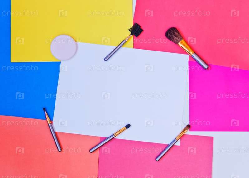 Кисти для макияжа на фоне красочной бумаги. Скопируйте место для вашего текста