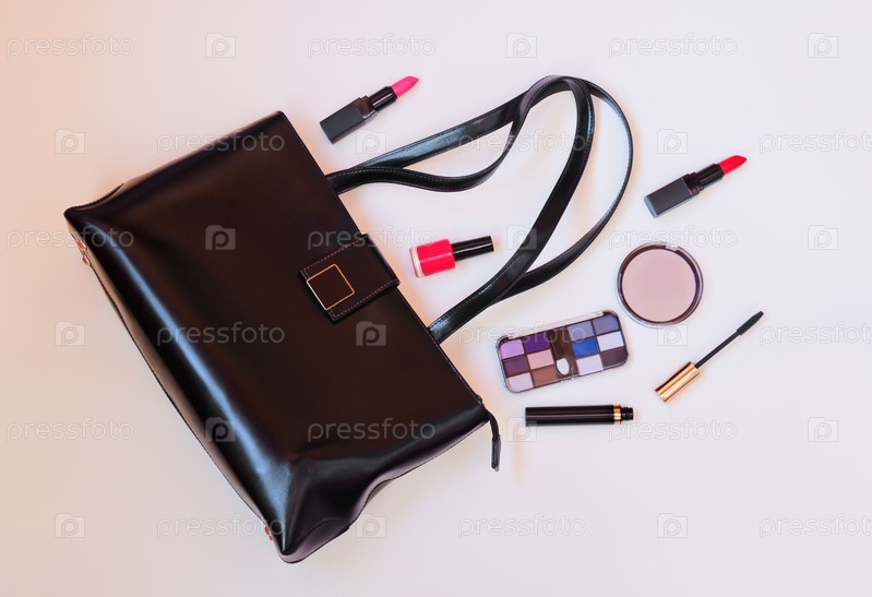 Концепция моды: черная кожаная женская сумка с косметикой на пастельном фоне