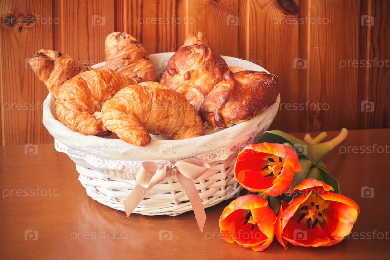 Ассорти из теста в корзине и цветы тюльпана. Выборочный фокус