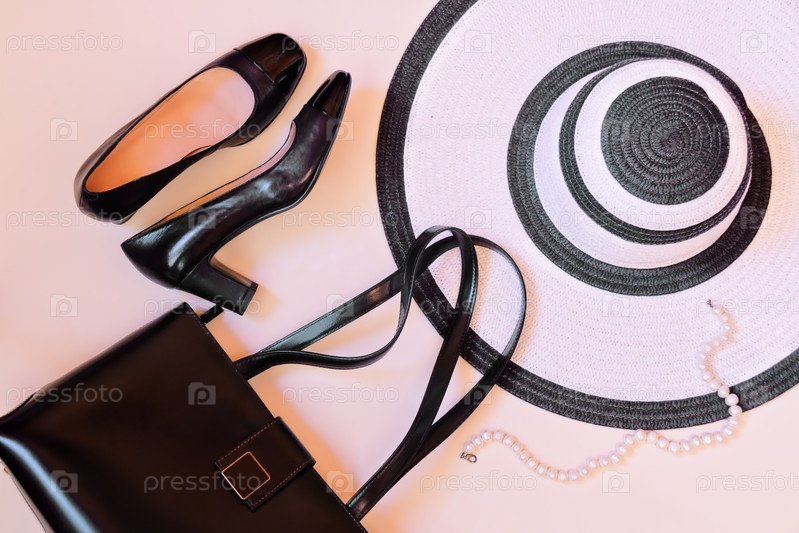 Вид сверху на кожаную сумку, шляпу и обувь на пастельном фоне