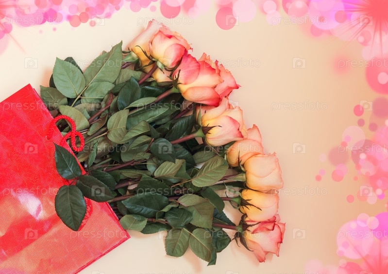 Красочные розы в красном подарочном пакете на бежевом фоне