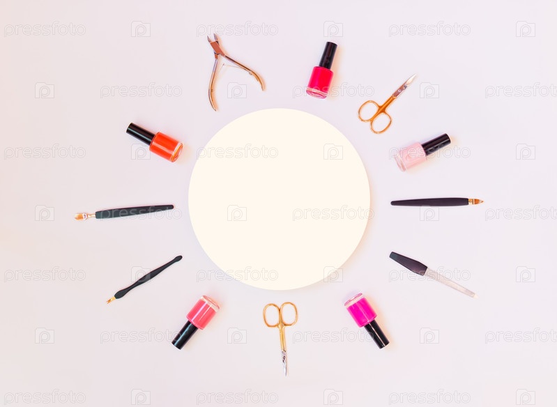 Маникюрное или педикюрное оборудование и лаки для ногтей на пастельном фоне