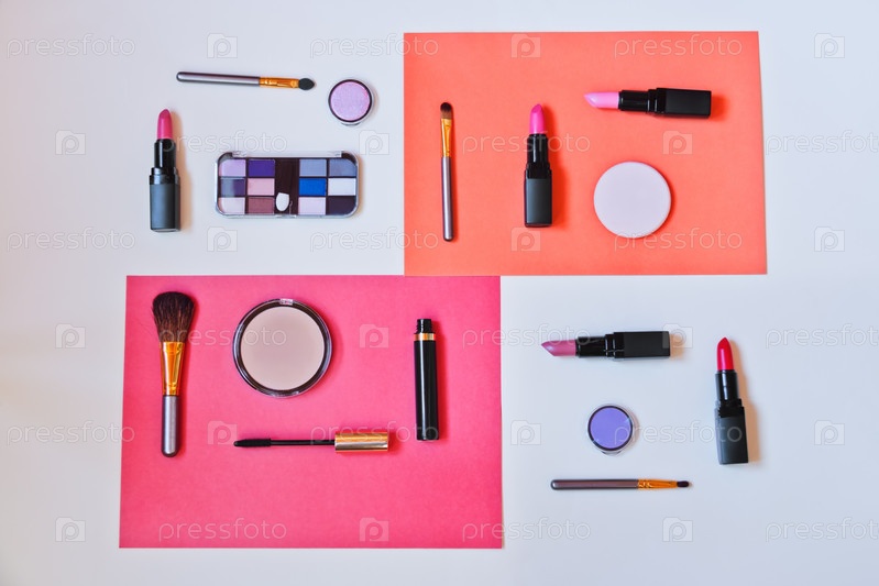 Косметика для макияжа и кисти на фоне красочной бумаги