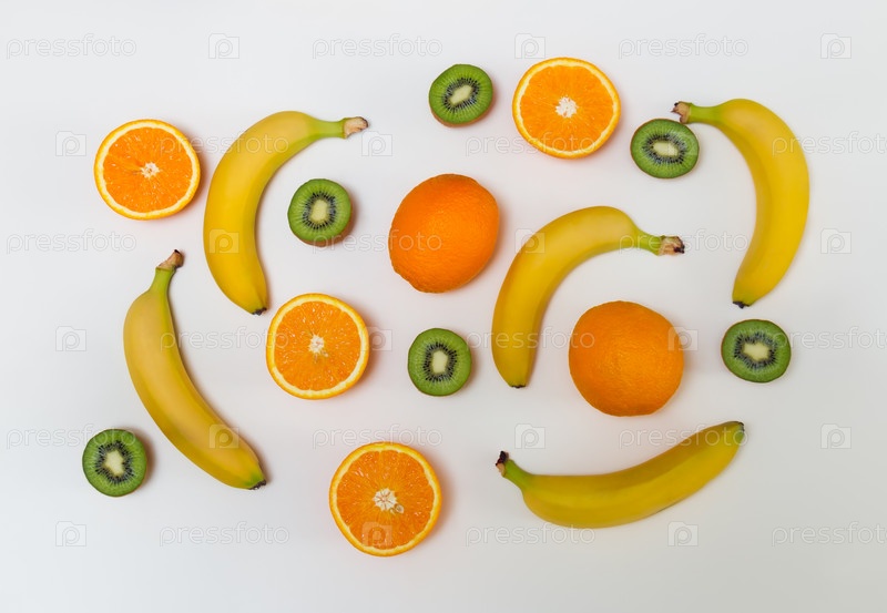 Пищевой узор из апельсинов, киви и бананов на пастельном фоне