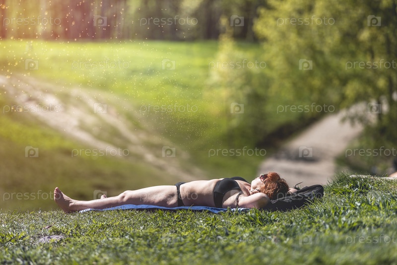 Женщина загорает на поляне в парке. Россия, Гатчина, май 2022 г