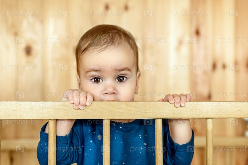 Маленькая девочка одного года стоит в кроватке