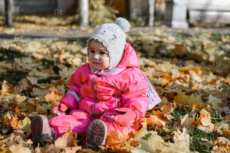 Маленькая девочка сидит на земле на желтых листьях осенью
