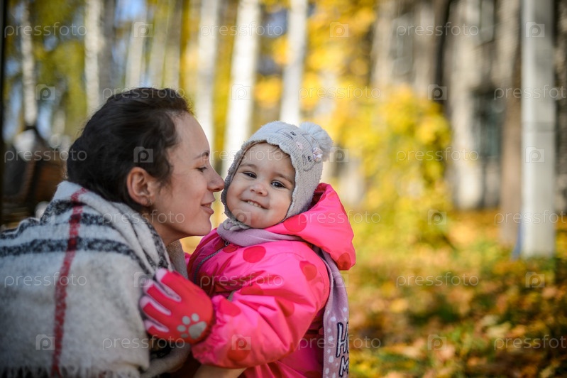 Молодая мама с маленькой дочкой в парке осенью крупным планом
