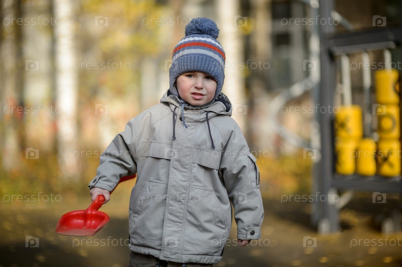 Трехлетний мальчик с лопатой на детской площадке