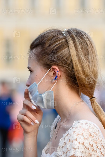 Портрет девушки в городе в медицинской маске на лице в городе