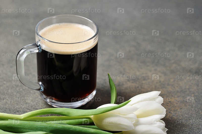 Чашка кофе и белые тюльпаны