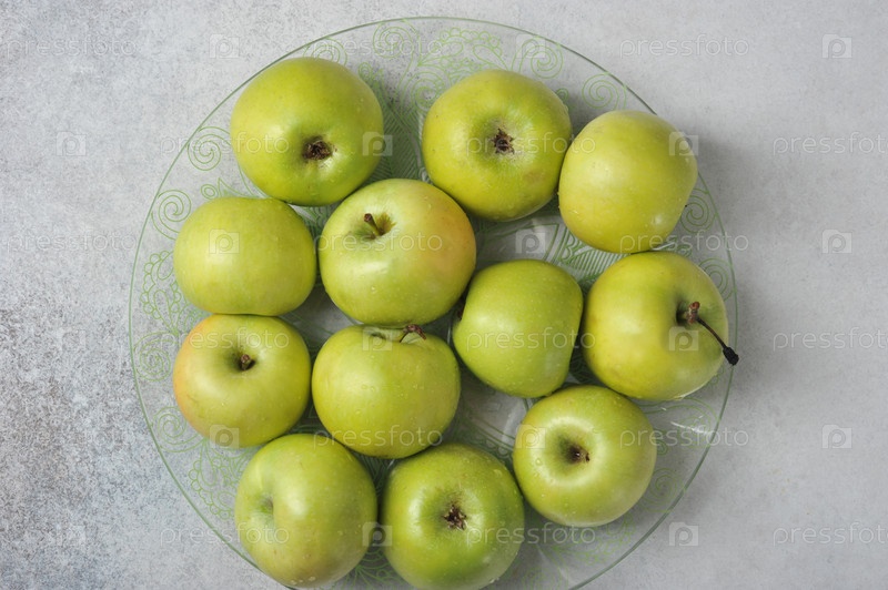 Зеленые цельные сочные яблоки на тарелке