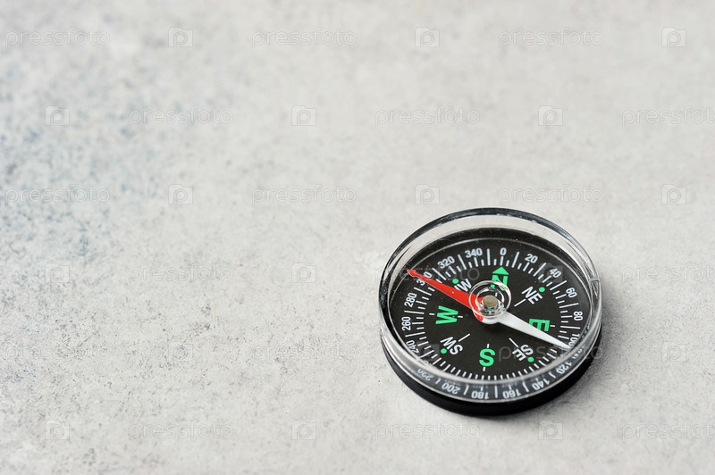 Компас с красной магнитной стрелкой на сером фоне с местом для текста