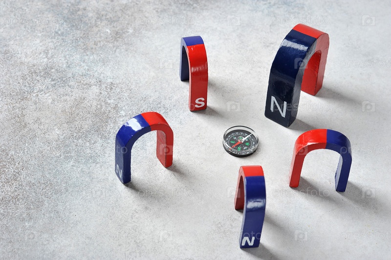 Компас лежит между разными магнитами - концепция проблемы