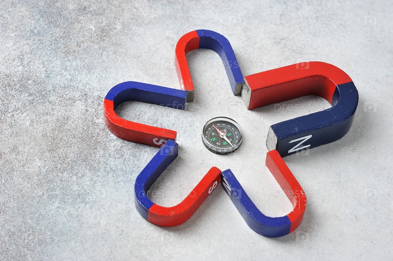 Компас лежит между разными магнитами - концепция проблемы