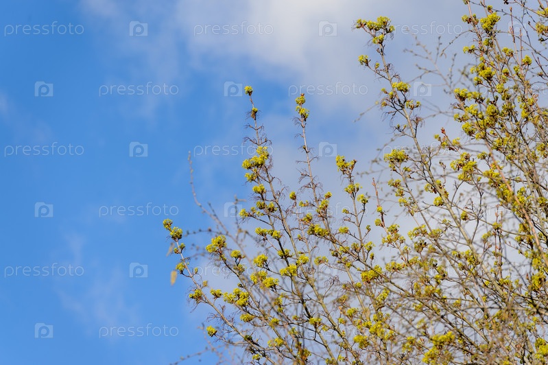 Ветви деревьев с зелеными листьями на фоне голубого неба