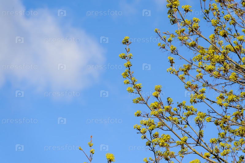 Ветви деревьев с зелеными листьями на фоне голубого неба