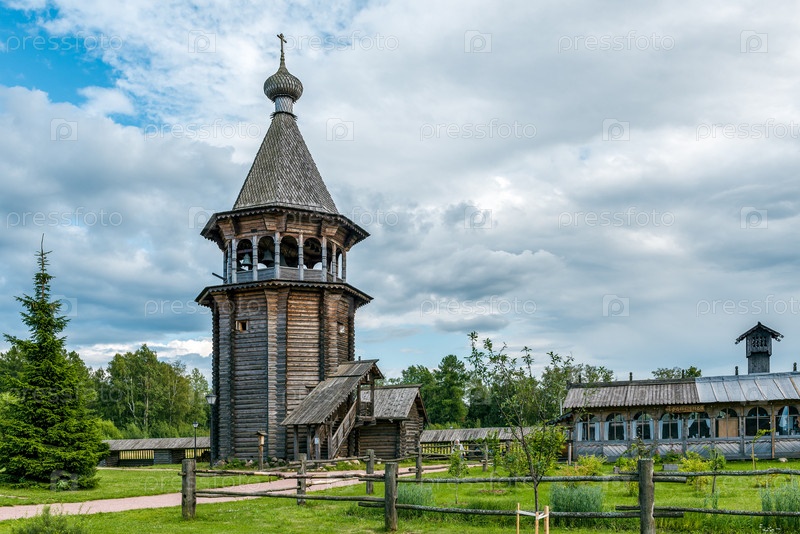 Россия, Санкт-Петербург 22 июля 2023 года: Усадьба Богословка в стиле древней деревянной русской архитектурной архитектуры