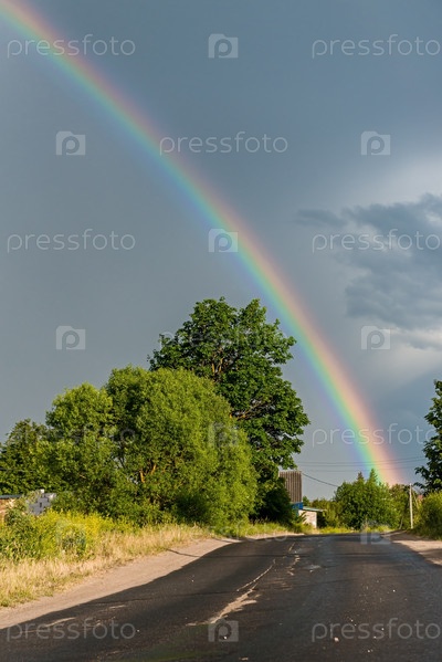 Двойная радуга на фоне дождливого неба над деревенской дорогой