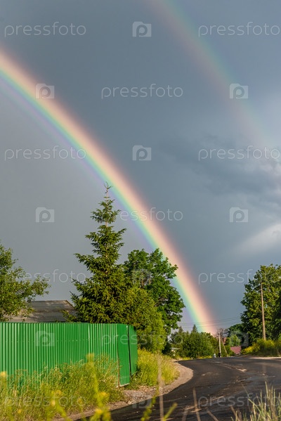Двойная радуга на фоне дождливого неба над деревенской дорогой