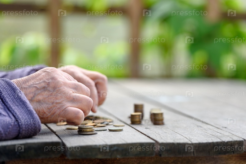 Деньги, монеты, бабушка на пенсии и концепция жизни, минимум - руки старухи пересчитывают монеты на деревянном столе