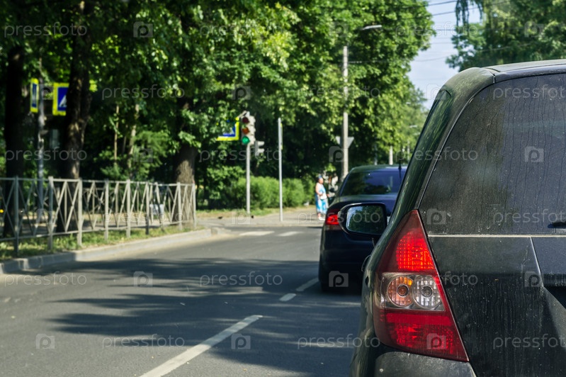 Россия, Санкт-Петербург, май 2023 года: движение автомобилей на заднем плане города