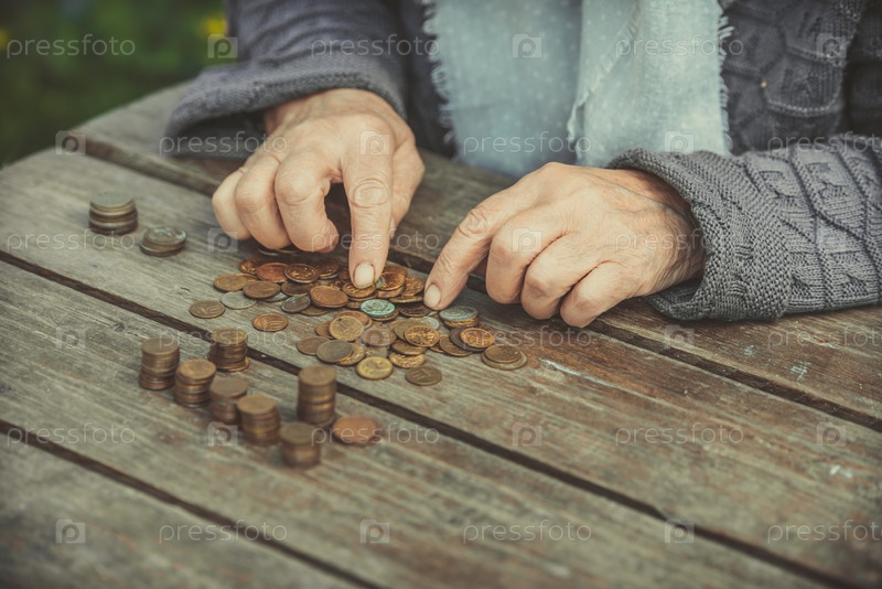 Деньги, монеты, бабушка на пенсии и концепция жизни, минимум - морщинистые руки старухи касаются монет на деревянном столе
