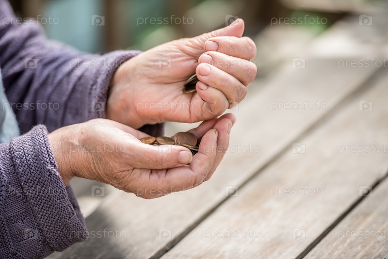 Деньги, монеты, бабушка на пенсии и концепция жизни, минимум - руки старухи пересчитывают монеты на деревянном столе
