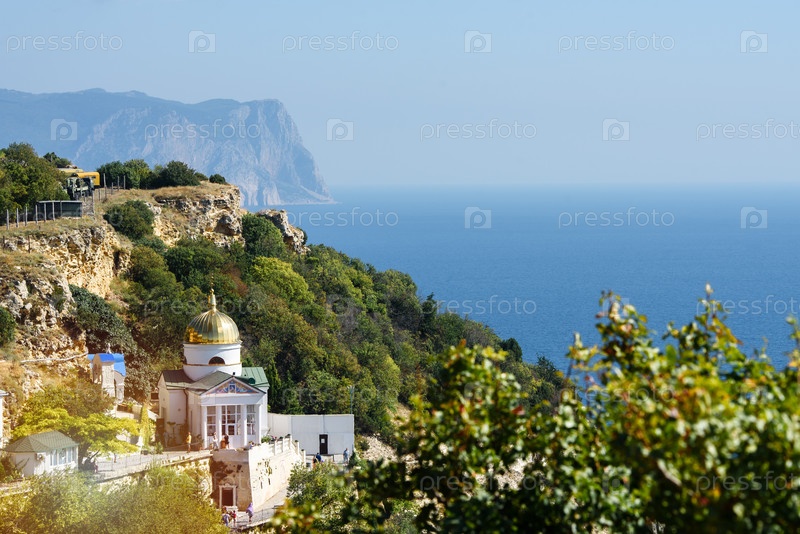 Крым, Балаклава, 15 сентября 2019 г.: монастырь Святого Георгия и пляж Яшма, вид сверху