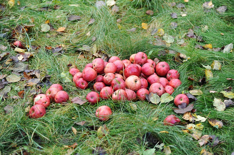 Сбор опавших осенних яблок - красные яблоки на траве