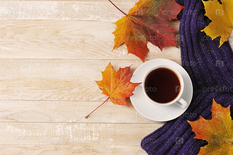 Чашка чая с шарфом и осенними кленовыми листьями