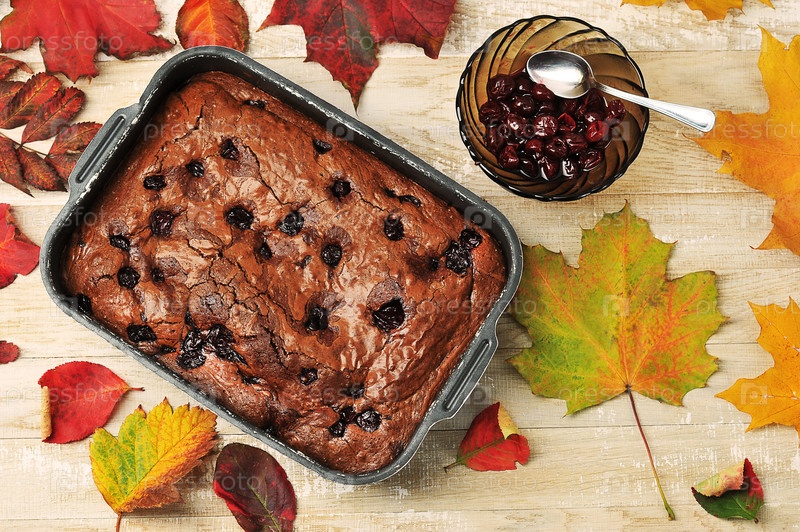 Брауни-пирог с вишней на деревянном фоне с осенними листьями