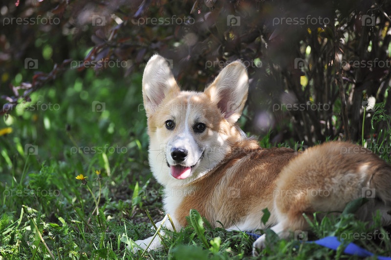 Вельш-корги пемброк лежит на поводке