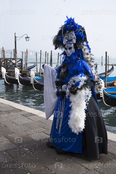 Венецианский карнавальный наряд, голубое платье на участнице карнавала, венецианская лагуна с гондолами