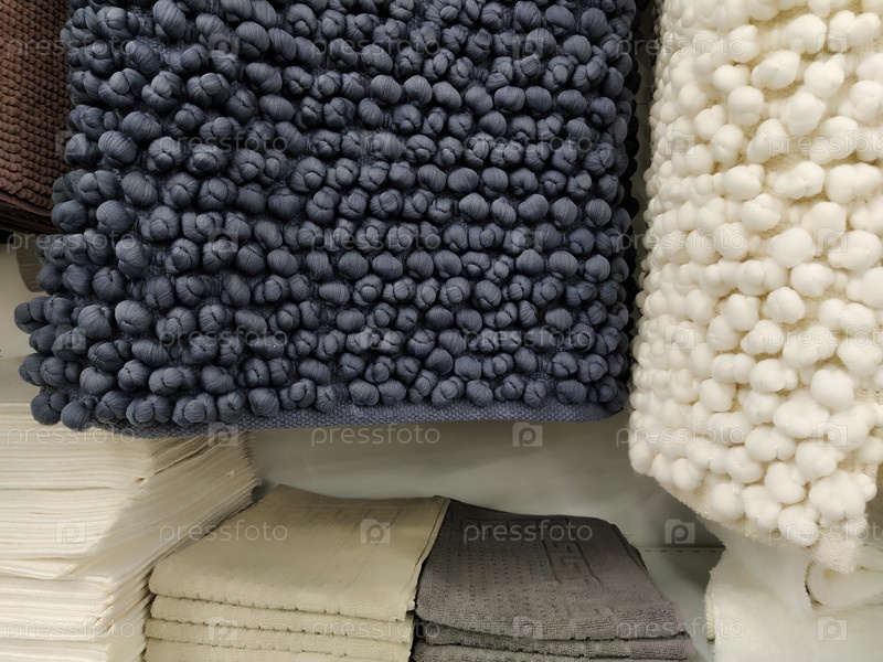 На прилавке магазина висят белые и серые коврики для ванной из микрофибры. Скандинавский стиль интерьера. Мягкие пупырчатые текстильные прямоугольные коврики с вязаными пупырышками. Отделка и современный дизайн ванной комнаты