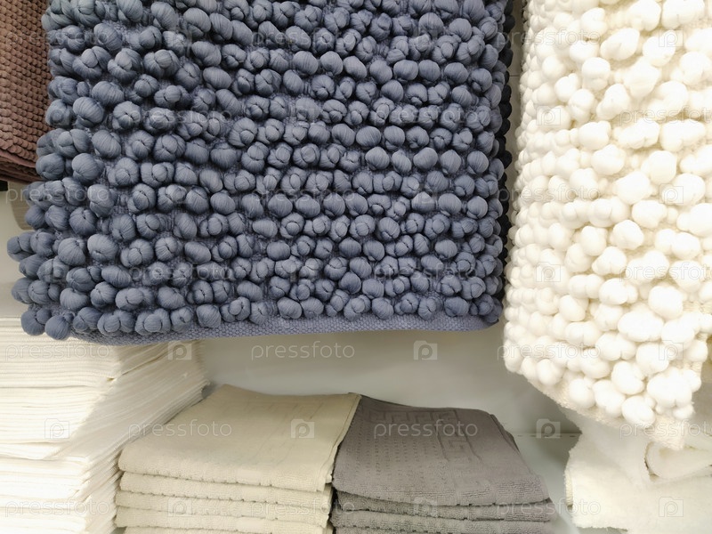 На прилавке магазина висят белые и серые коврики для ванной из микрофибры. Скандинавский стиль интерьера. Мягкие пупырчатые текстильные прямоугольные коврики с вязаными пупырышками. Отделка и современный дизайн ванной комнаты
