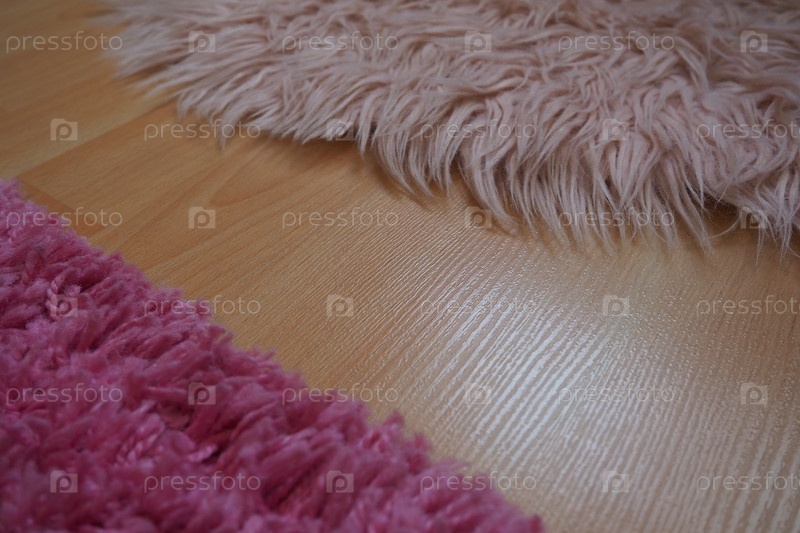 Длинный ворсовый ковер розового цвета на бежевом ламинированном полу. Женственный интерьер комнаты или спальни девушки или женщины. Дизайн интерьера в розовых тонах. Полы – ламинат. Роль пылевых клещей при аллергии