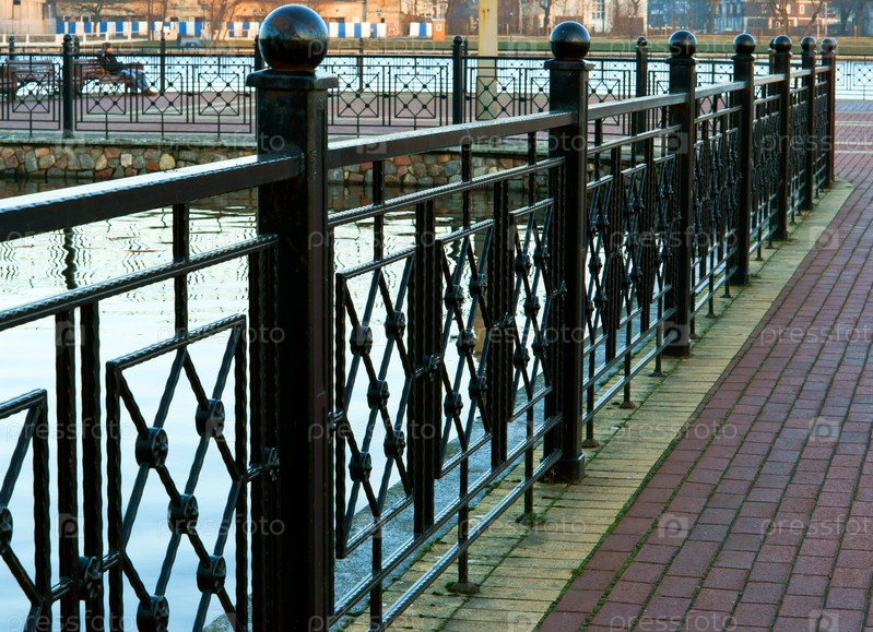 Забор из кованого железа на озере, ограждение берега озера