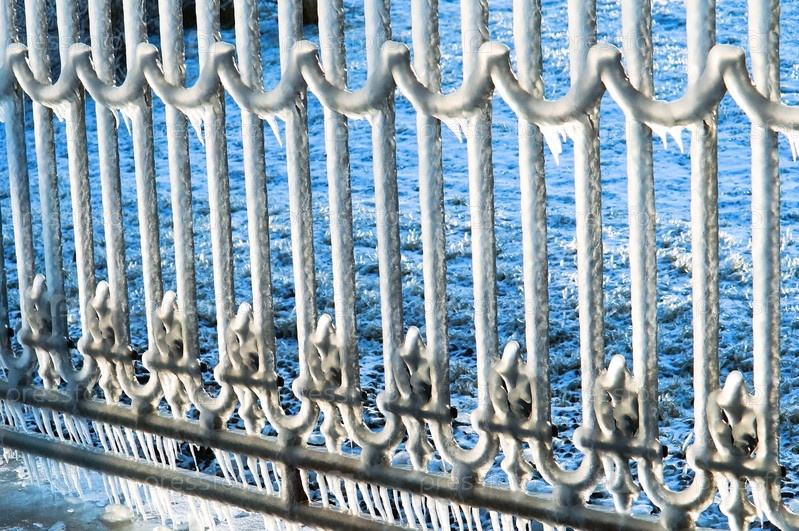 Металлический забор покрыт льдом, зима на Балтийском море, обледенение на набережной, пирс во льду